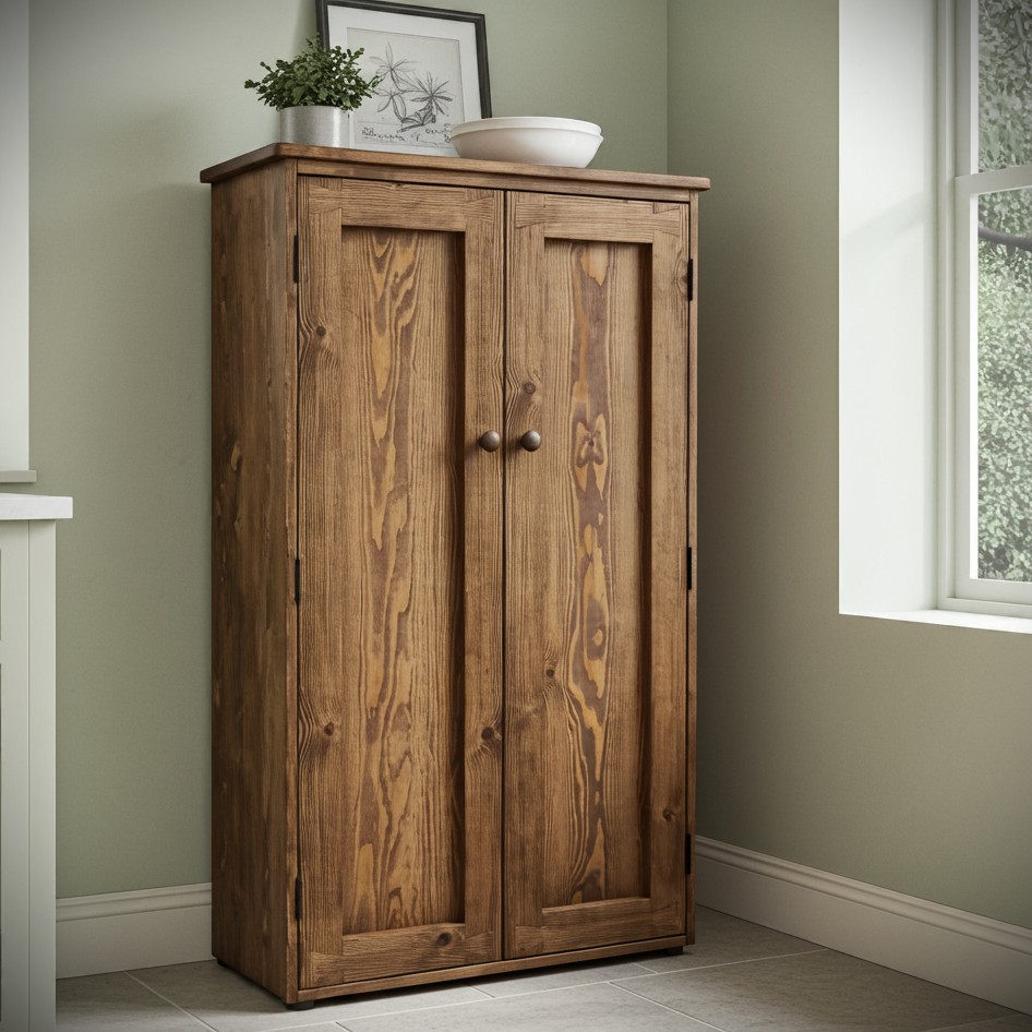 The double kitchen larder cupboard in the main pictures has been finished in a dark wood Danish Oil and we also offer a light wood finish, please select your choice when ordering.