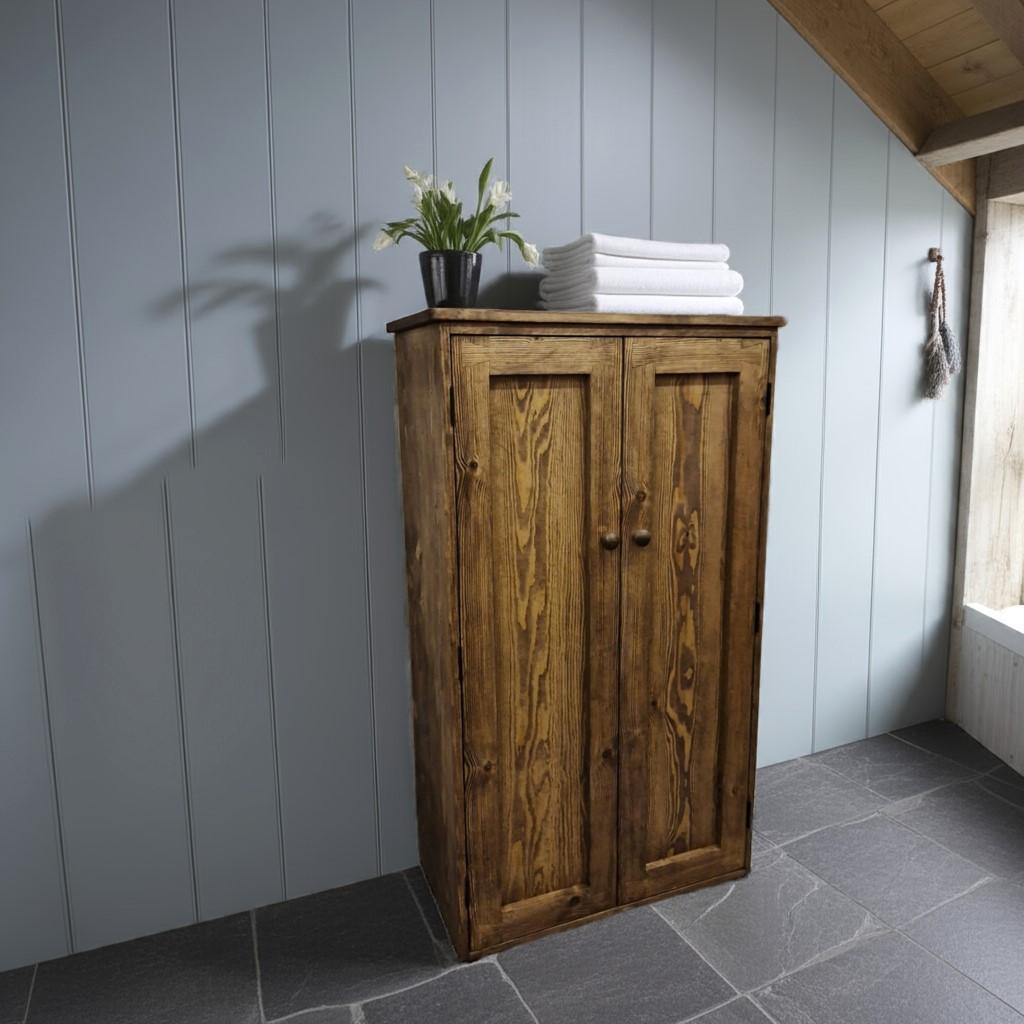 Keep your bathroom, utility space or bedroom well kept with our tall rustic wooden floor cabinet with classic double doors and plentiful shelves.