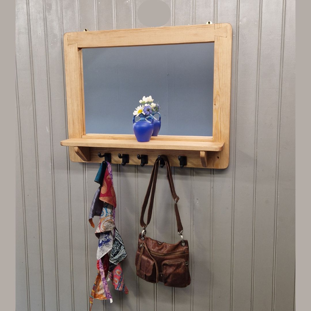 Large mirror with shelf and chunky iron hooks in our modern rustic style; featuring our signature ‘dovetail’ decoration at the corners of the natural wooden frame and 5 coat key hooks set below the shelf.