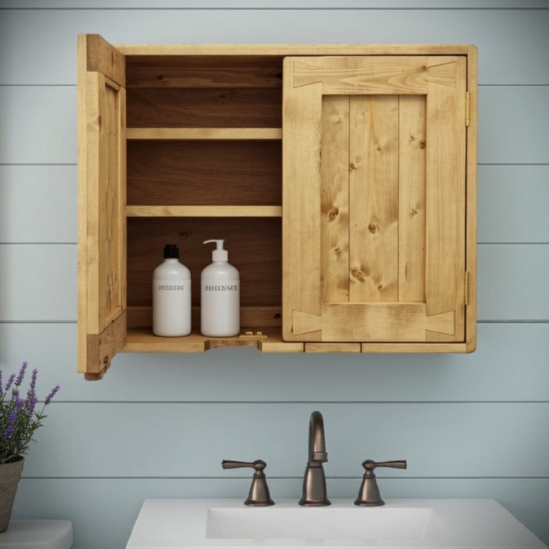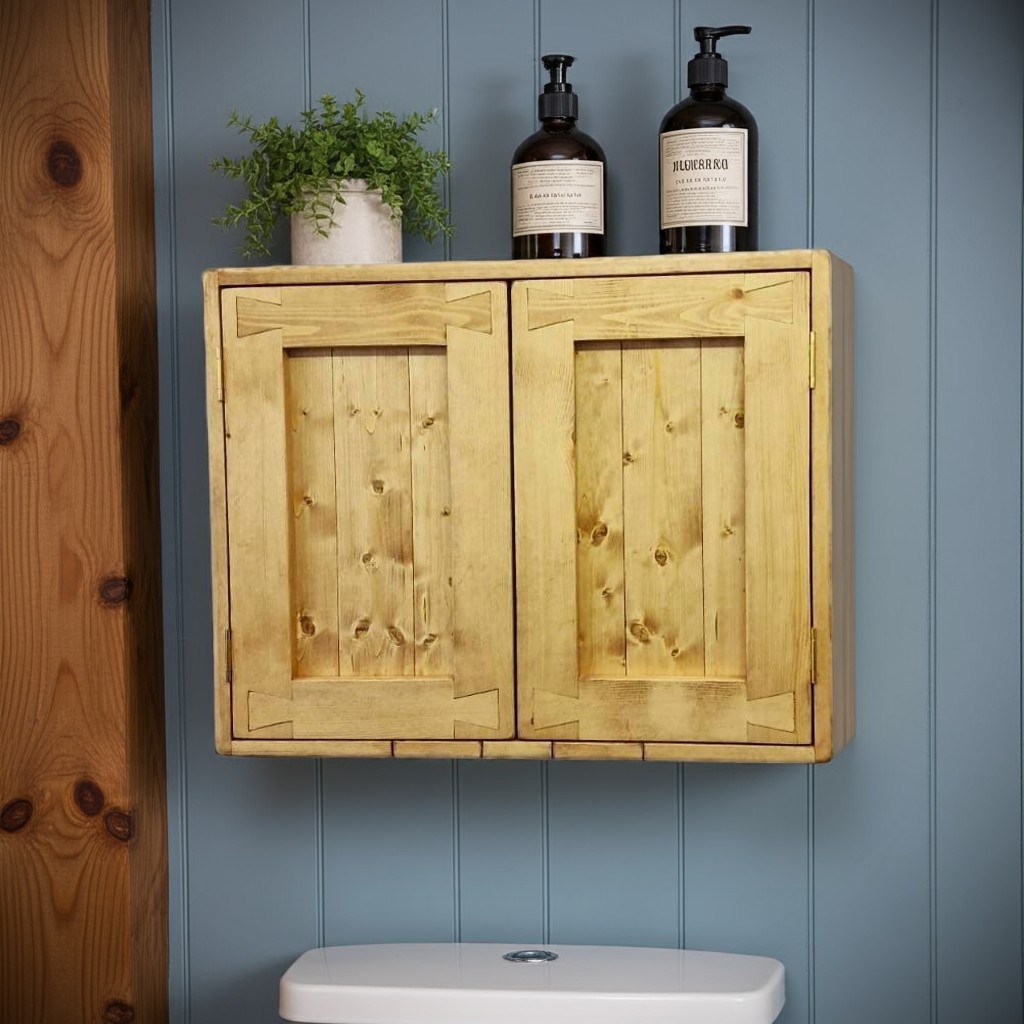 Our large wall wooden rustic bathroom cabinet with double ‘dovetail’ doors comes with brass hinges and a ball catch closing mechanism.