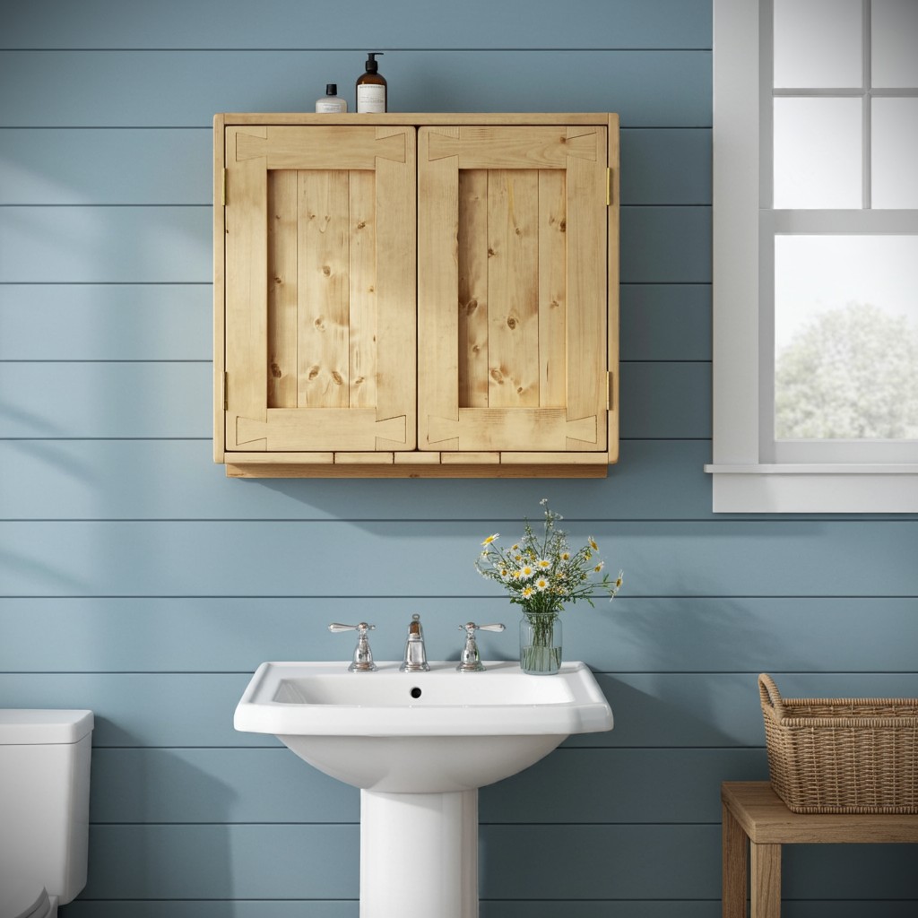 Rustic bathroom cabinet with ‘tongue and groove’ style double wooden doors handmade in Somerset from natural FSC Redwood timbers.
