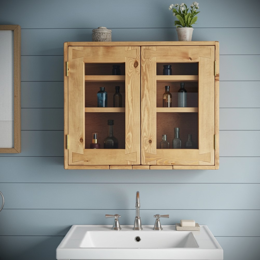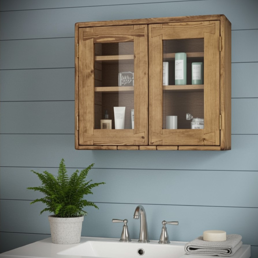 Our chunky wooden bathroom cabinet with double ‘dovetail’ glass doors is easy to put on the wall in your home, please see our installation page for more details.