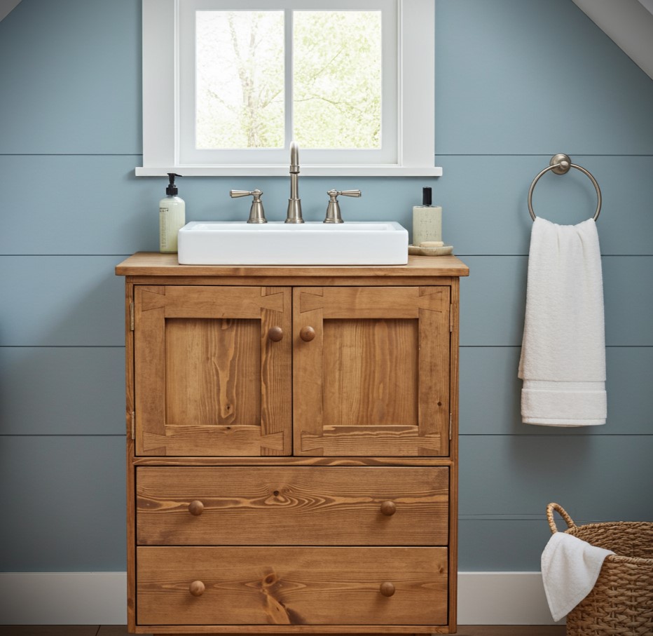 Rustic wooden sink stand comes with a solid Plywood back panel.