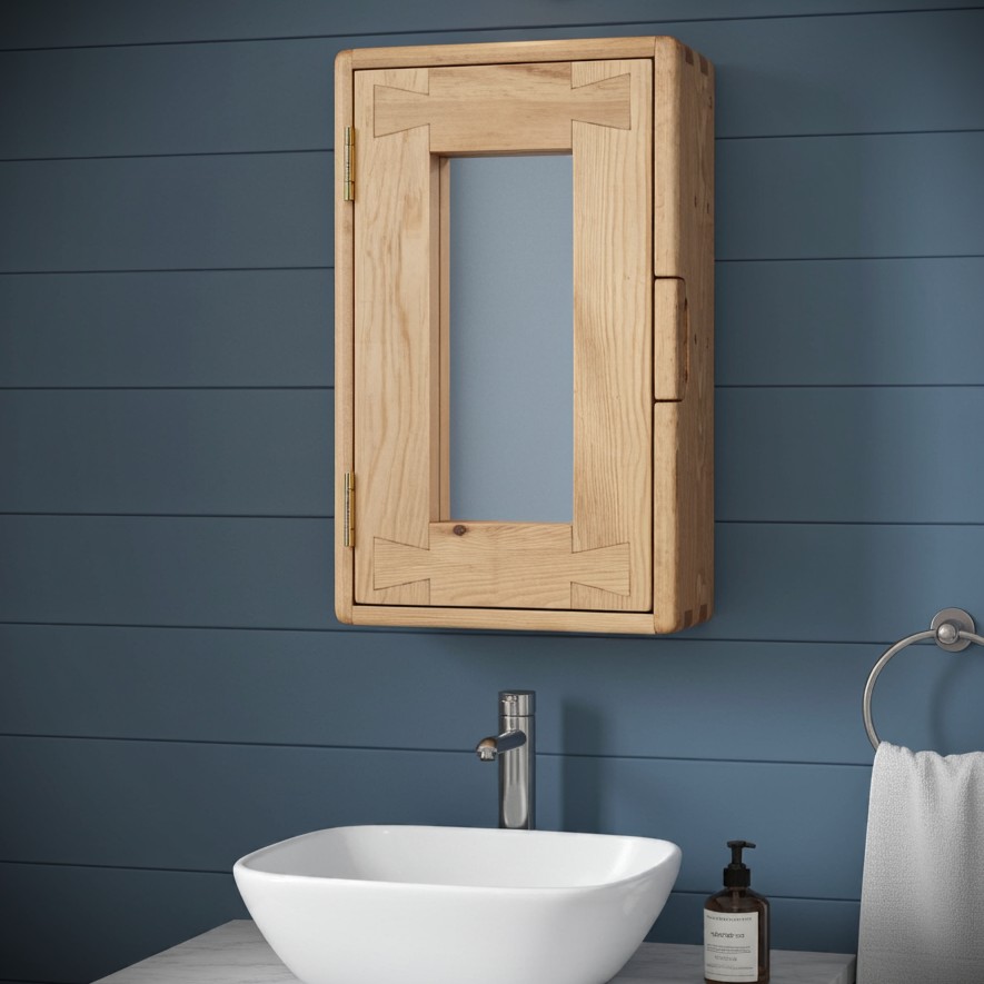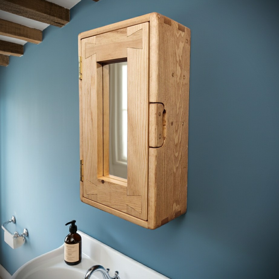 Slim bathroom mirror cabinet with a single door features our signature tapered dovetail joints at the corners of the wooden door frame; these are contrasted with the dainty finger joints on the softly curved medicine cabinet body.