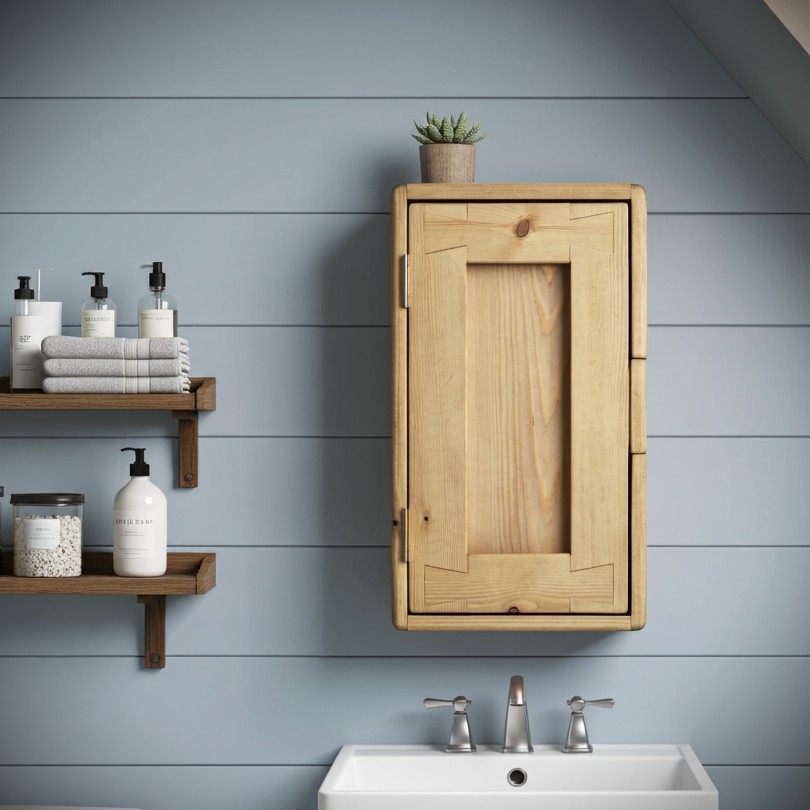 This rustic ‘modern cottage’ style slim wooden bathroom cabinet features brass hinges and a ball catch closing mechanism.