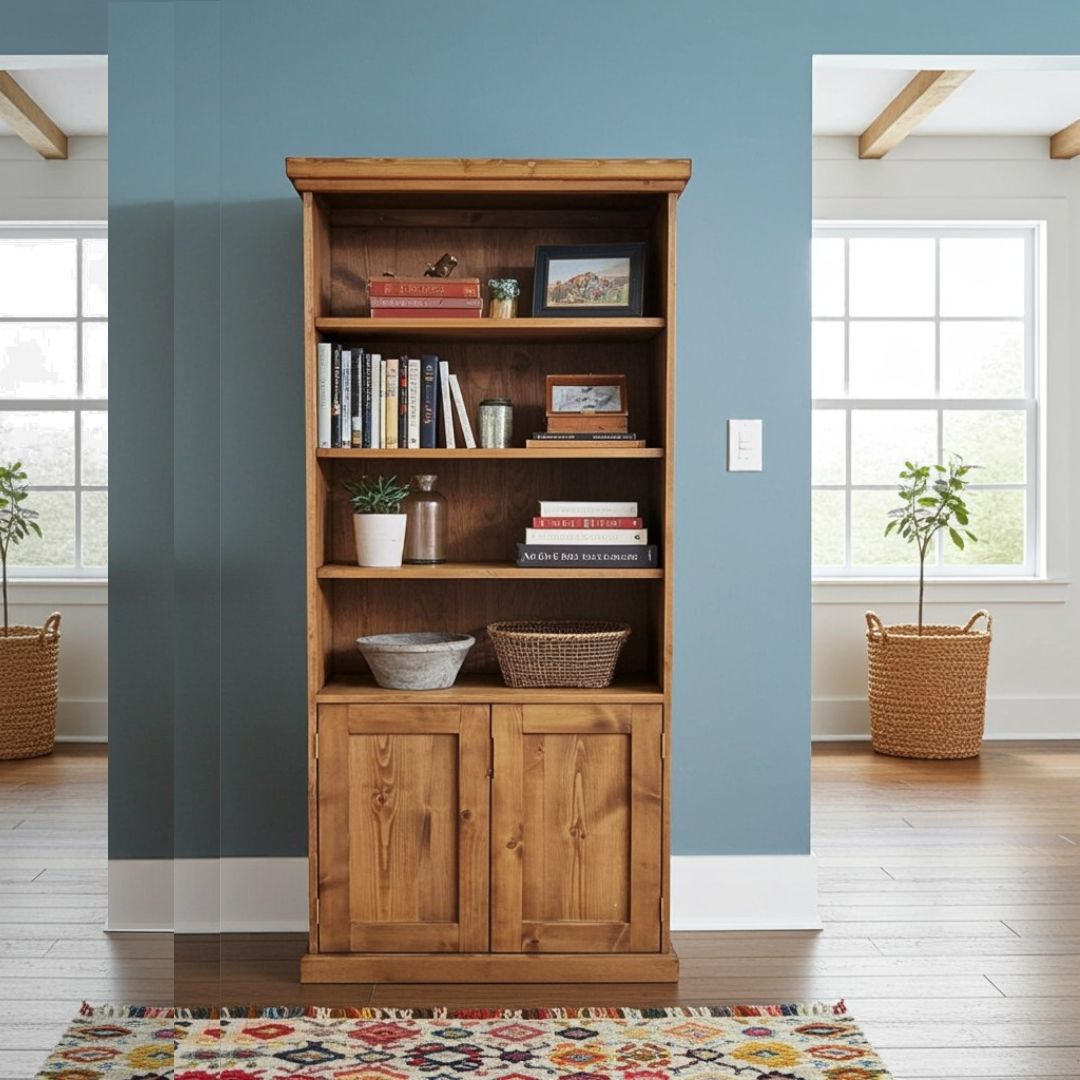 The wooden bookcase with doors in the main pictures has been finished in dark Danish Oil and we also offer a light finish (last image) please let us know your wood tone choice when ordering.